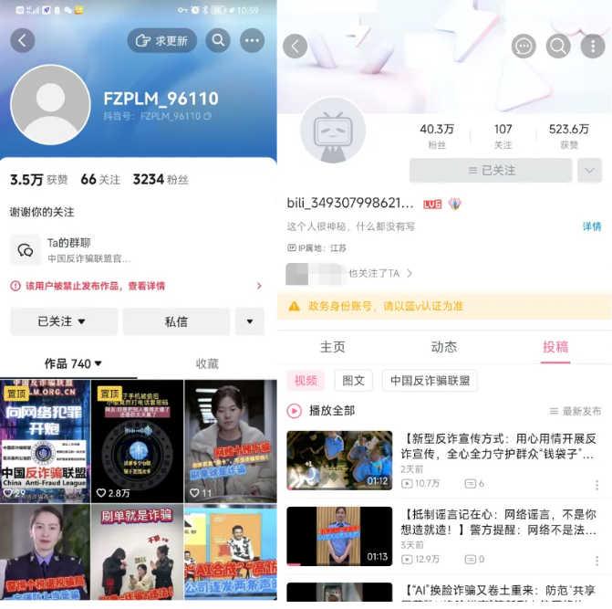 在“中国反诈骗联盟”的真面目被揭露以前,它是反诈领域的“领头羊”。自2023年1月1日的第一个投稿以来,“中国反诈联盟”截至目前已发布近千条反诈视频,其中许多视频播放量都已达到百万级别。